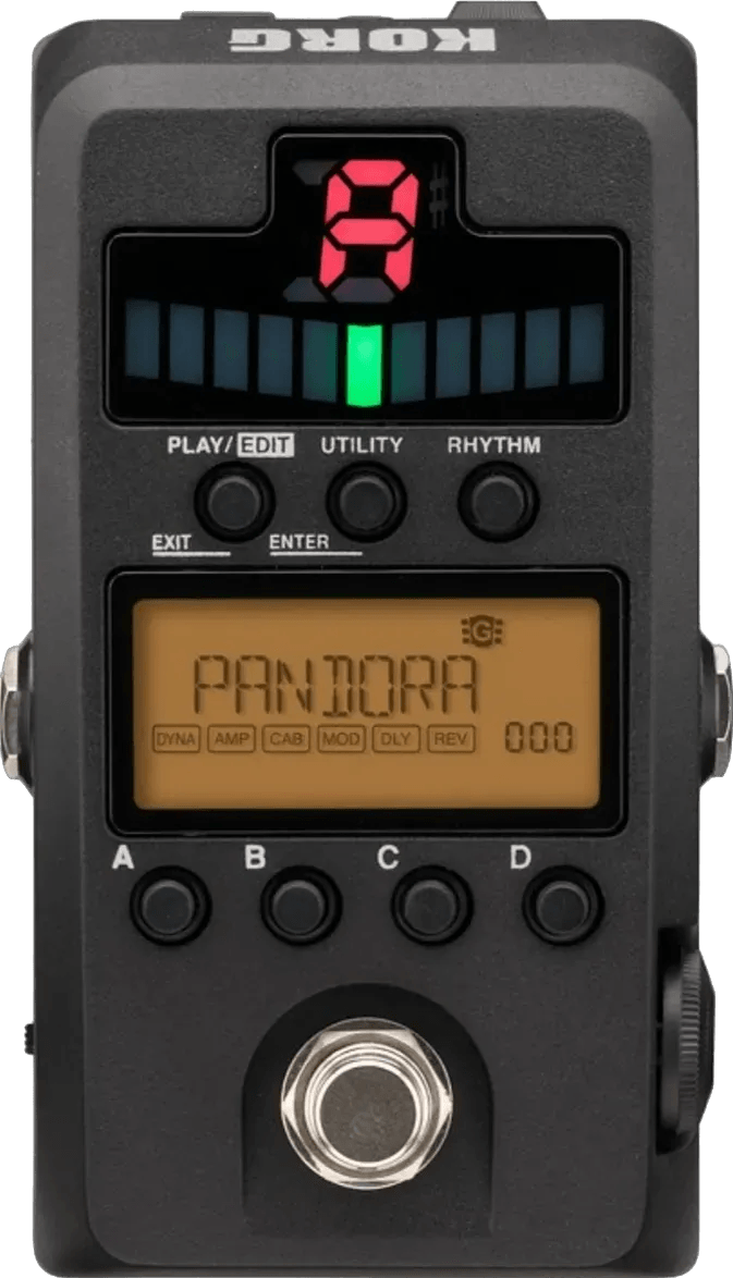 The Pandora Stomp is a multi-effects pedal designed for a wide range of sound shaping, incorporating 158 built-in effect models, including delays, modulation, overdrive/distortion, amp simulation, and more. Up to seven effects can be used simultaneously. The pedal features 200 user presets and 100 rhythm patterns for built-in accompaniment. An integrated auto tuner with LED display is included for real-time tuning adjustment. Connectivity options include an AUX input for MP3 player integration, with the ability to transpose the input signal by an octave up or down.