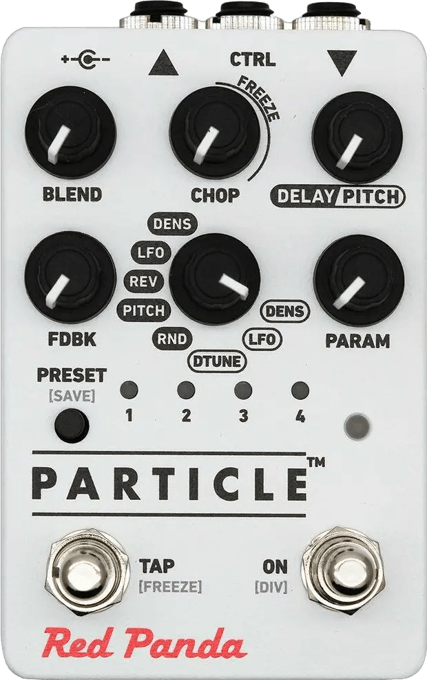 The Red Panda Particle 2 is a granular delay and pitch shifting effects pedal designed for real-time manipulation of audio using granular synthesis techniques. This digital delay pedal slices incoming audio into small grains, rearranges them, and applies pitch shifting and modulation for a variety of glitch, time-stretch, and stutter effects. Particle 2 features 127 user presets, an extended delay time up to 2500 ms at an increased sampling rate, and includes eight granular synthesis modes. Tap tempo is supported for synchronizing delay time, LFO rate, grain size, and density, with independent note division controls. Connectivity includes an assignable expression pedal input and USB MIDI for deeper parameter access. The pedal supports foot control via the optional Red Panda Remote 4 switch.