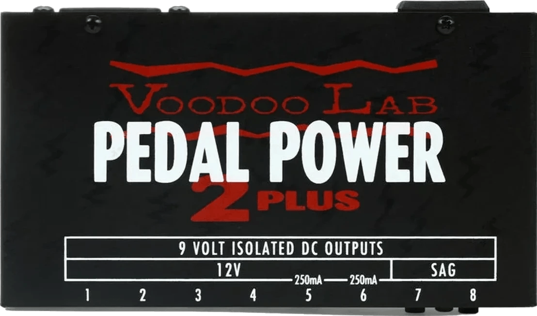 The Pedal Power 2 PLUS is an isolated effects pedal power supply designed to power a range of analog and digital stompboxes, including vintage and modern effects. It features eight galvanically isolated 9V DC outputs, with six outputs capable of switching to 12V and two capable of delivering 250mA for devices requiring higher current. The unit also offers a SAG function on two outputs, providing variable voltage to simulate the characteristics of a low battery. Additional voltage options of 18V and 24V can be accessed by combining outputs with specific cabling. An onboard 200-watt courtesy AC outlet is included for running an additional device or another power unit.