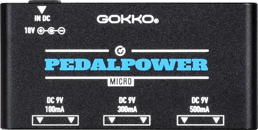 The Gokko Power Supply is a multi-output power source designed for powering effects pedals on pedalboards. It features six isolated 9V outputs, accommodating a range of current requirements for different effects pedals and stompboxes. Each output is designed for quiet, stable power delivery. The power supply operates with an AC input range of 110V-240V, making it suitable for international use, and includes a built-in bright blue LED for clear pedalboard illumination.