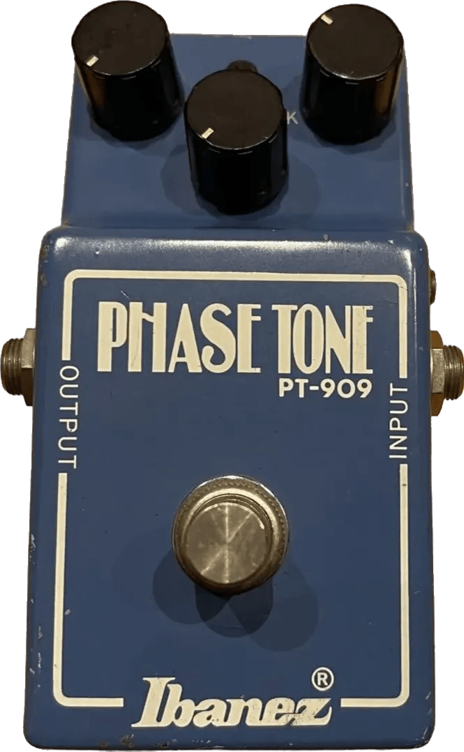 The Ibanez PT-909 Phase Tone is an analog phaser effects pedal featuring a 4-stage phasing circuit. Originally manufactured from 1979 to 1982, this phase shifter pedal includes Speed, Width, and Feedback controls for shaping modulation parameters. The unit has a round footswitch and a red LED indicator. Power options include a 9V battery or an external AC adapter.