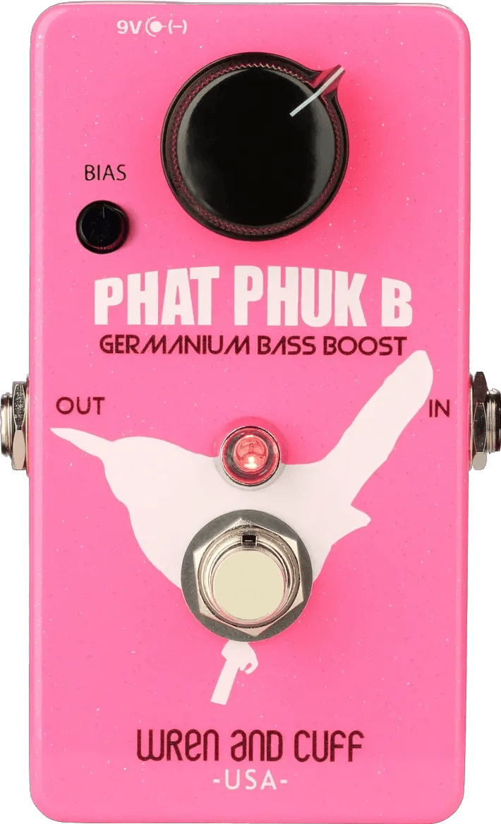 The Phat Phuk B V2 is a hybrid germanium/JFET boost pedal designed for bass, offering dynamic clean boost and light overdrive tones. Utilizing a J201 JFET transistor in combination with a selected NOS germanium transistor, this bass boost stompbox enhances top-end clarity with controlled grit. V2 adds an external bias knob for precise tweakability, and an internal slide switch to alternate between standard output and phase-inverting buffered output for expanded routing flexibility. The pedal features a volume control with a wide, usable sweep for incremental gain settings. True bypass switching maintains signal purity when disengaged.