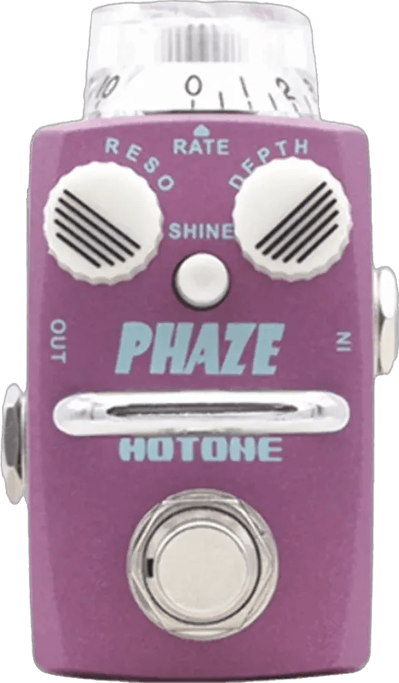 The Hotone Phaze is an analog phaser effects pedal designed to deliver classic 1970s-style phasing sounds with expanded control options. This phaser stompbox features RESO, DEPTH, and RATE knobs, allowing users to shape the phasing effect from gentle modulation to more pronounced, textured movement. The SHINE button adds a bright, shimmering character to the modulation for increased tonal versatility.