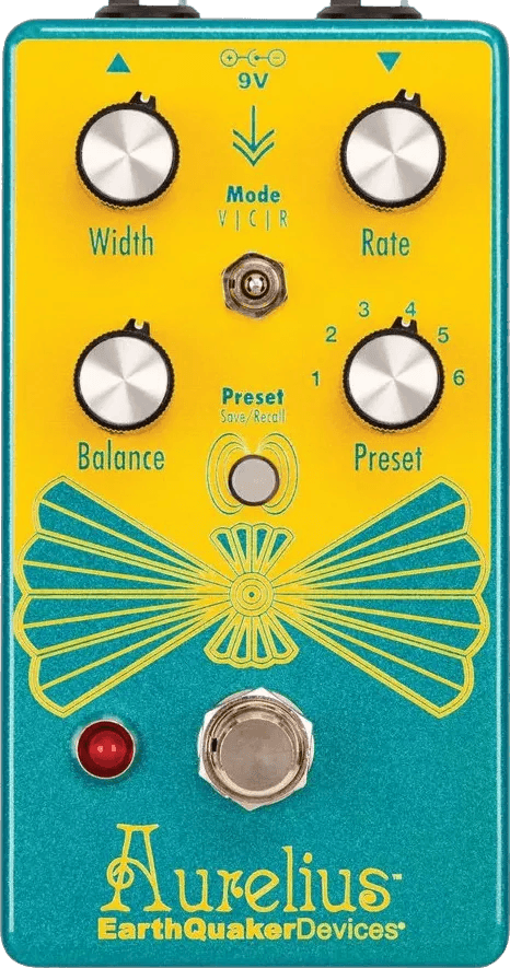 The EarthQuaker Devices Aurelius is a multi-mode digital chorus pedal providing access to three effects types: chorus, vibrato, and rotary speaker modulation. Featuring six programmable presets, the Aurelius allows instant recall of saved settings for performance flexibility. Width, Rate, and Balance parameters can be tailored for each effect mode, with seamless mode switching for diverse sound design.