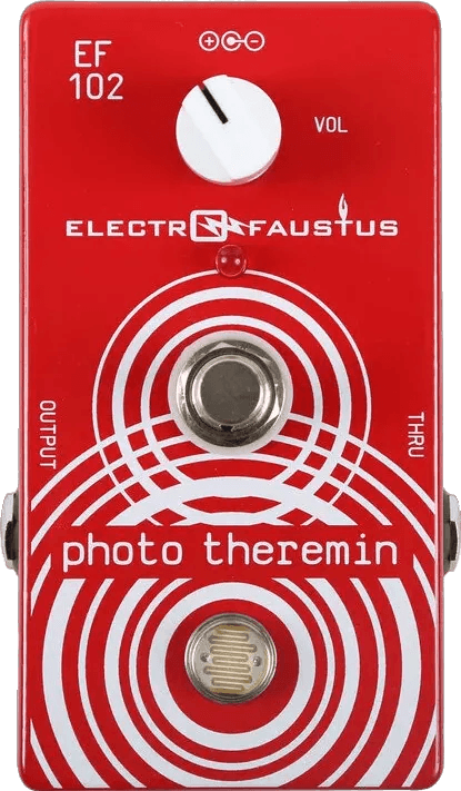 The Electro-Faustus EF102 Photo Theremin is a light-sensitive synthesizer effects unit that generates theremin-style pitch control by responding to changes in light over its photocell sensor. This compact photo theremin enables hands-free pitch manipulation, making it possible to create a range of frequency sweeps and electronic sound textures. The EF102 can be integrated with external effects processors, such as analog delay pedals or reverb pedals, for expanded sonic possibilities.