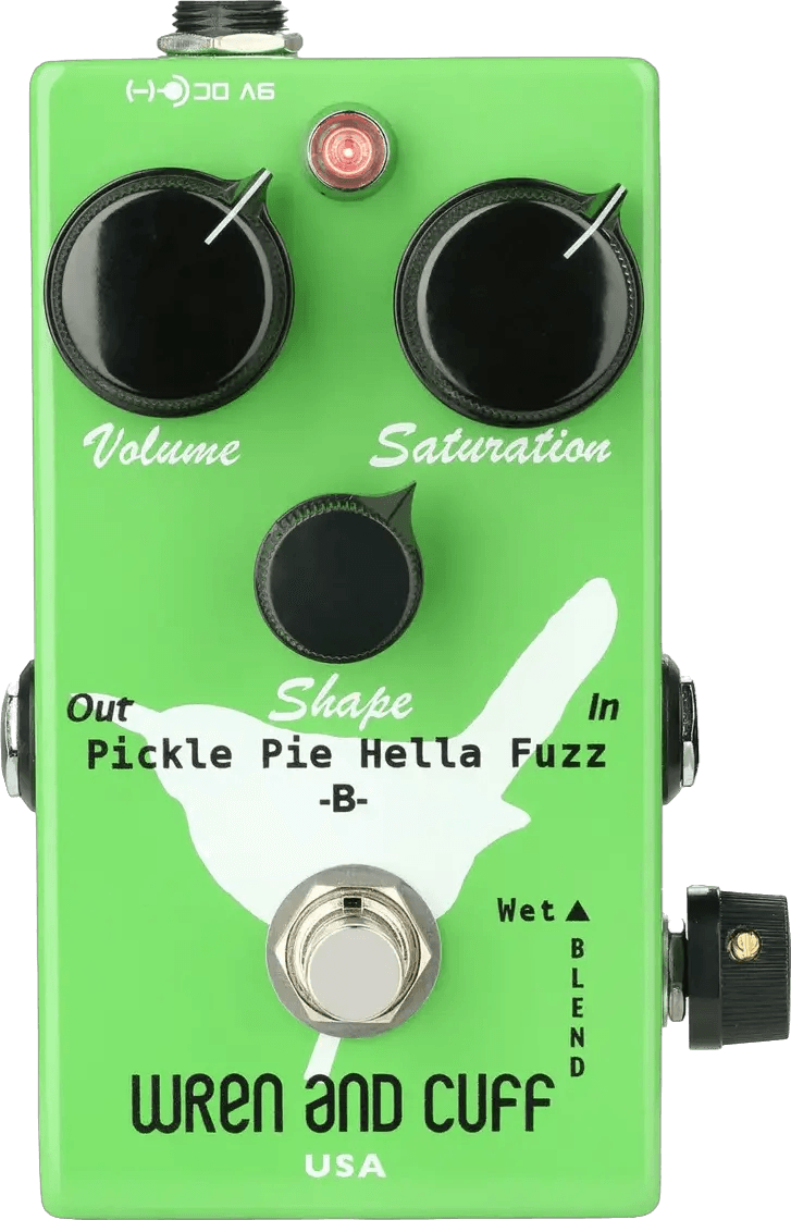 The Wren and Cuff Pickle Pie B is a bass fuzz effects pedal designed specifically to preserve low-end response and deliver a range of saturated distortion tones for bass instruments. Based on the Pickle Pie pedal, this model includes a FET-buffered active clean-boost to prevent signal drop-outs when engaging the pedal. It features a FET-hybrid clipping section, offering a blended fuzz that integrates smoothly with the clean signal, rather than sitting distinctly on top. The Shape control’s tone-stack is tailored for bass, with a subtle mid-scoop that maintains presence in live mixes. The Saturation control allows for adjustment from light, gritty overdrive to fully saturated fuzz tones.