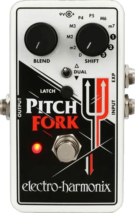 The Electro-Harmonix Pitch Fork is a pitch shifter effects pedal that shifts instrument pitch across a +/- three octave range. It supports three operation modes—up, down, or simultaneous up/down transposition. The pedal allows for both fixed interval and continuously variable pitch shifting, and includes an expression pedal input or CV input for real-time control over the shift amount.