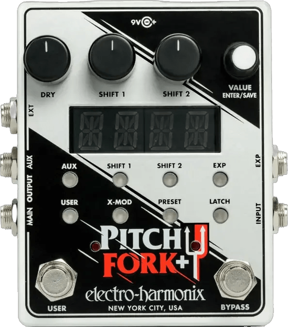 The Electro-Harmonix Pitch Fork+ is a polyphonic pitch shifter pedal designed to provide independent pitch shifting with extensive control. This EHX effects pedal features two separate pitch engines, each capable of transposing signals up or down within a ± three-octave range. Fine tuning is possible with a detune range of ±99 cents. The Pitch Fork+ utilizes advanced tracking and maintains tonal integrity for accurate and musical harmonization. Connectivity options and control sets ensure integration into various pedalboards and setups.
