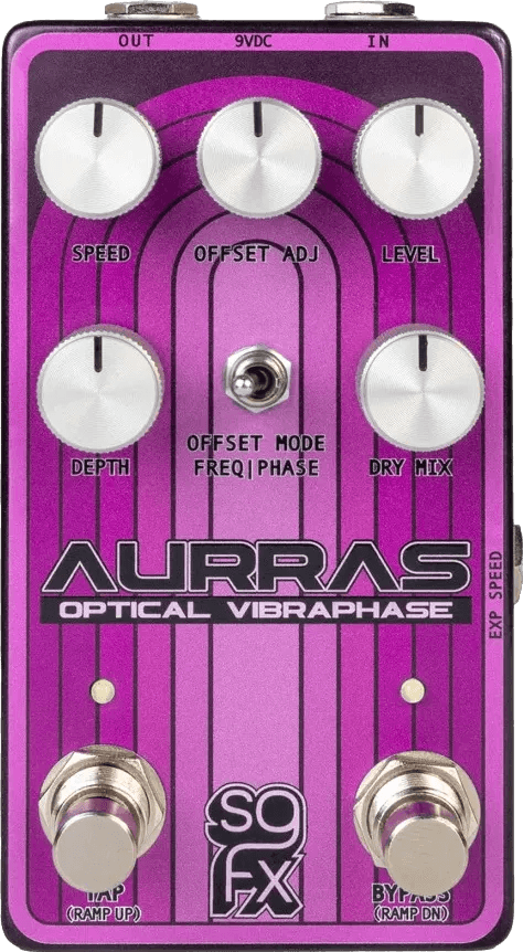 The SolidGoldFX AURRAS Optical Vibraphase is an optical phase shifter effects pedal designed to deliver a range of vintage Uni-Vibe-inspired modulation tones alongside more contemporary phase textures. This modulation pedal combines classic optical circuitry with modern enhancements, offering extensive control over depth, rate, and tone shaping for detailed sound tailoring. The Aurras Optical Vibraphase provides both mono and stereo output options and features true bypass switching for signal integrity. Connectivity includes expression pedal input for hands-free parameter adjustments and CV input for modular integration. This phaser pedal is suitable for use with bass instruments and is built for flexible performance and studio use.