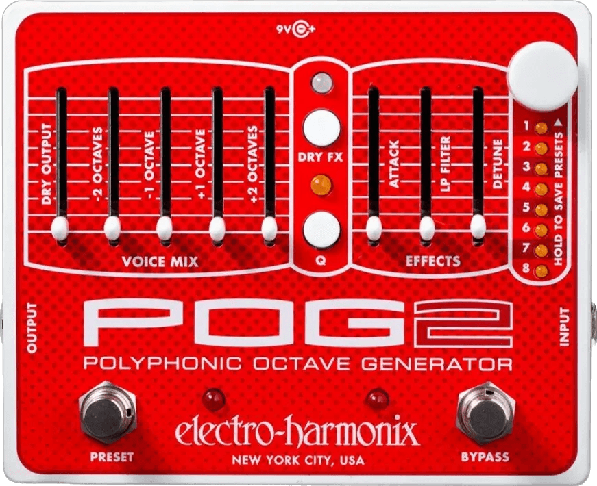 The Electro-Harmonix POG2 is a polyphonic octave generator effects pedal designed for creating a wide range of harmonic textures by blending up to five independent octave voices. This pedal uses an enhanced digital algorithm for precise pitch tracking and includes an Attack control that allows for adjustable fade-ins of harmonics. It also features a 2-pole resonant low-pass filter with selectable Q modes for tonal shaping. The POG2 offers eight programmable presets for saving and recalling custom sounds. True bypass switching ensures signal integrity when the effect is not engaged. The POG2 is compatible with bass instruments.