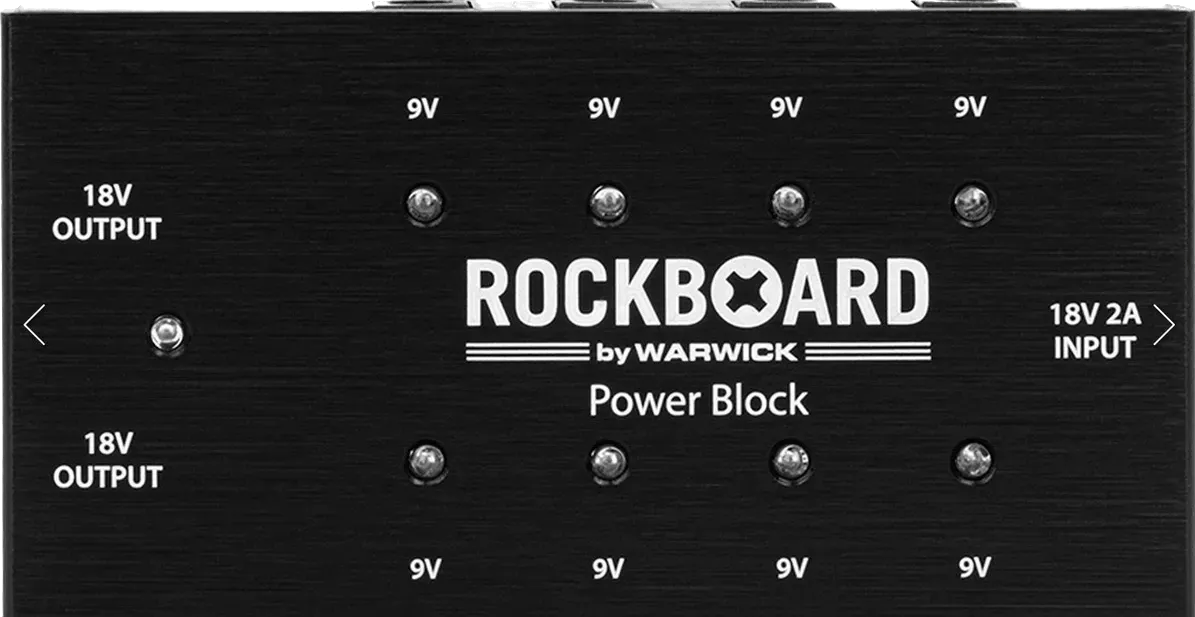 The RockBoard Power Block is a compact multi-output pedal power supply designed for powering multiple effects pedals at once. It features 10 isolated power slots—eight 9V outputs delivering a combined total of 1,200 mA, and two 18V outputs providing 800 mA total. This pedalboard power supply includes 10 connection cables and an 18V DC power adapter with 2,000 mA capacity, plus interchangeable plug adapters for global use.