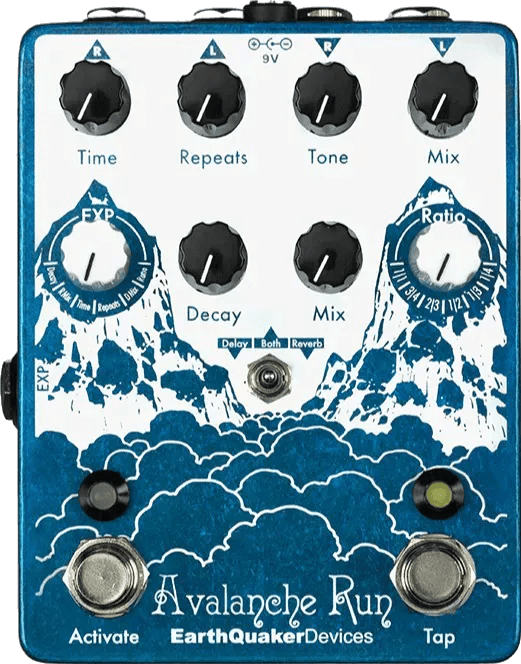 The EarthQuaker Devices Avalanche Run v1 is a stereo delay and reverb effects pedal designed to deliver analog and tape-style delay sounds with added modulation and reverb capabilities. This EarthQuaker Devices effects pedal includes tap tempo with subdivisions, a reverse delay mode, and a swell feature. An expression pedal input allows for flexible real-time control over assigned parameters. The Avalanche Run v1 features true bypass or buffered bypass with trails options and supports stereo input and output. The pedal is suitable for use with bass instruments and built in Ohio, USA.