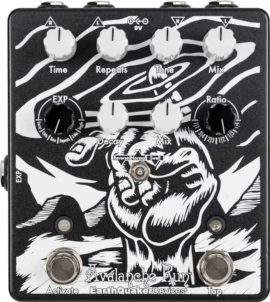 The EarthQuaker Devices Avalanche Run V2 Lottery League Edition is a stereo delay and reverb effects pedal designed for creating ambient soundscapes. This pedal offers up to 2 seconds of delay time, paired with a lush stereo reverb. Users have full control over delay time, repeats, mix, and voice via tone adjustment, as well as independent control of reverb length and mix. The pedal operates in three selectable modes: Normal (standard delay and reverb), Reverse (reversed delay with standard reverb), and Swell (volume swell response to dynamics). Avalanche Run V2 supports both true bypass and buffered bypass with trails, and features relay-based soft touch switching. Audio will not pass if the unit is unpowered.