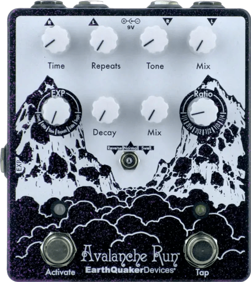 The EarthQuaker Devices Avalanche Run V2 is a stereo reverb and delay effects pedal offering up to 2 seconds of delay and lush stereo reverb processing. It features adjustable delay time, repeats, mix, delay tone, reverb length, and reverb mix. Three selectable modes—Normal, Reverse, and Swell—provide a range of delay and reverb interactions, including reverse delay and dynamic volume swells. The Avalanche Run V2 includes tap tempo control, stereo inputs and outputs, and supports both true bypass and buffered bypass with trails via silent relay-based switching. All units are hand assembled in Ohio, USA.