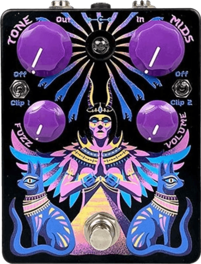 The Black Arts Toneworks Priestess is a multi-stage fuzz effects pedal that merges several classic Big Muff circuit variations into one unit, providing a range of fuzz textures from dynamic to compressed sustain. The pedal features four independent gain stages: the Pharaoh-inspired first stage with higher headroom for stacking, a Green Russian-style second stage for solid attack and low end, a NYC Reissue with Creamy Dreamer mod third stage for high gain, and a final LSTR stage for elevated output. EQ options include a full-range tone control and a variable mids control for shaping from deep scoop to mid boost. Two toggle switches adjust clipping diodes on the second and third stages, allowing combinations of diode and open clipping for versatile fuzz character.