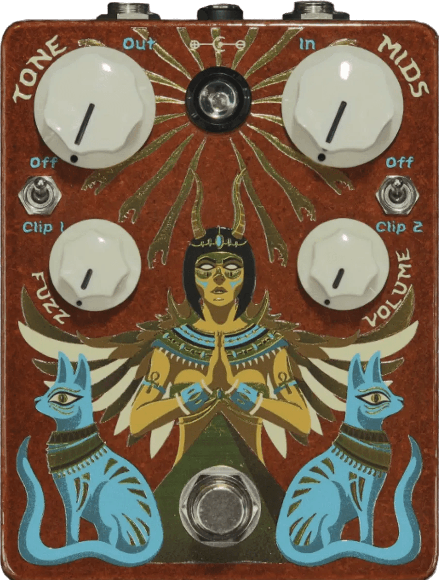 The Caroline Guitar Company Priestess is a fuzz stompbox that combines circuit elements from multiple Big Muff Pi variants into one effects pedal designed for extensive tone shaping. It features a mids control capable of sweeping from a deep scoop to a subtle midrange boost, allowing for a wide range of fuzz textures. Two toggle switches provide additional control over the clipping diode configuration, enabling users to switch between dynamic, open fuzz and highly compressed sustain.