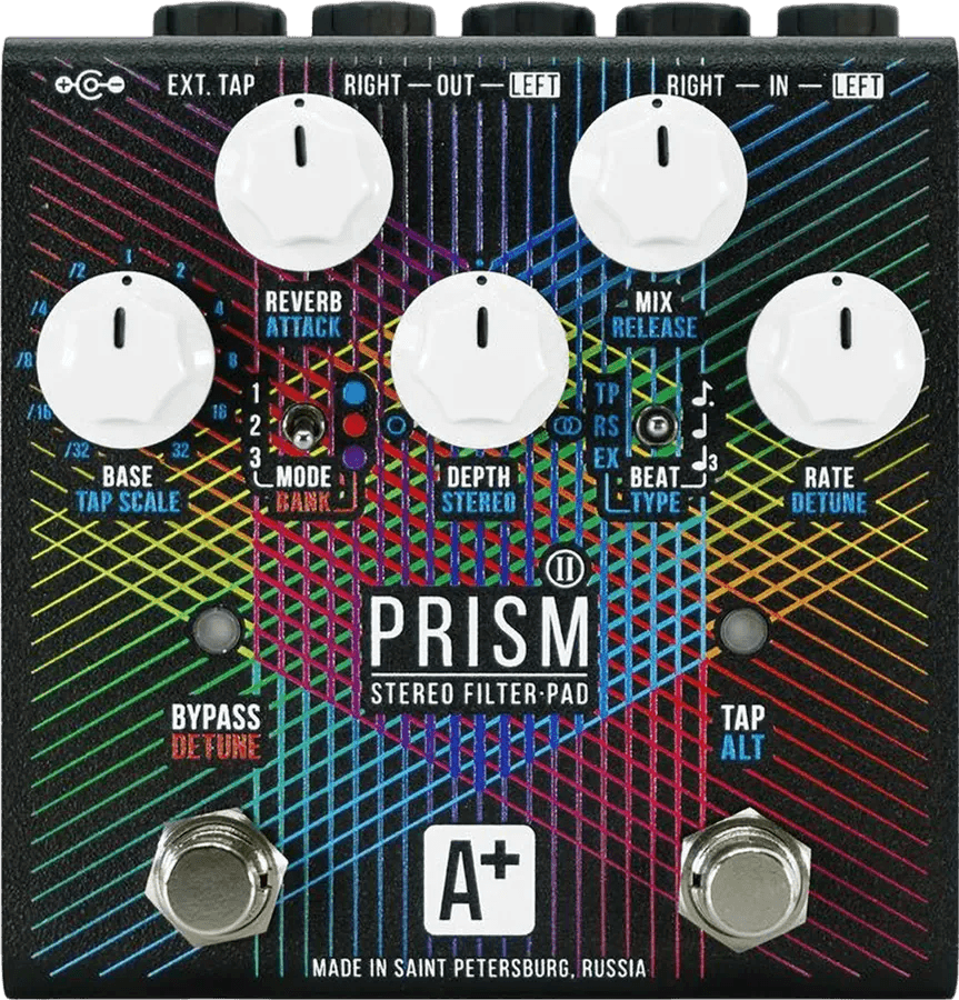 The A+ Prism II is a stereo multi-effects pedal that integrates subtractive and additive synthesis, frequency, temporal, and spatial modulation, multiple pitch shifting sections, multimode filters, and reverb processing. Designed as a unified sound-shaping device, the Prism II features three independent pitch shifters, four multimode filters, two modulation blocks, and a dedicated reverb section—all accessible across two fully stereo effect chains. Each stage includes separate mixing options, and four assignable LFOs enable advanced stereo and filter modulation. The effects pedal offers onboard tap tempo with external clock sync capability, an expression pedal simulation mode, and a dedicated DETUNE function.