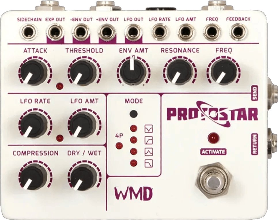 The Protostar is an envelope filter effects pedal that integrates an onboard LFO, four selectable filter modes, and extensive control voltage (CV) connectivity. Designed with a full CV patch bay and expression/CB input, this envelope filter pedal offers comprehensive modulation and control options. An integrated end-of-chain compressor and dedicated dry/wet mix control enable parallel filtering and compression effects.
