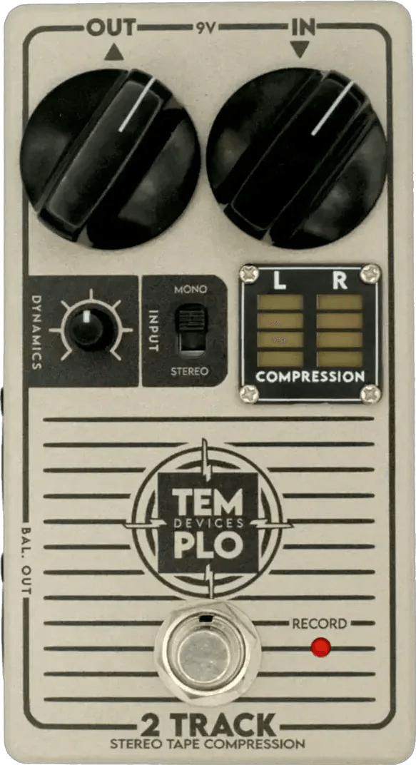 The Templo Devices 2 Track Tape-Style Compressor is a stereo compression and boost pedal designed to deliver tape-inspired dynamics and mild distortion. Utilizing a dual diode compressor circuit, the pedal produces smooth, heavily colored compression reminiscent of vintage cassette tape processing. An input volume knob provides pre-compression gain and allows the user to achieve subtle harmonic distortion, especially in the upper range. Integrated VU metering displays real-time compression response, while dual XLR outputs enable flexible stereo connectivity for pedalboard or studio setups. This analog compressor pedal is compatible with both stereo operation and bass instruments.