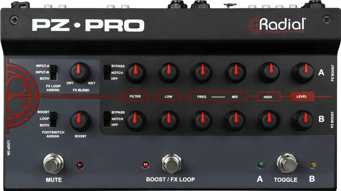 The PZ-Pro is a two-channel instrument preamp and DI pedal designed for tone shaping, EQ control, and effects integration. Each channel features a dedicated EQ section with a filter designed to minimize feedback. Channel two provides a microphone input compatible with dynamic and condenser microphones, including clip-on instrument microphones. The PZ-Pro’s three footswitches allow users to switch between channels, control a built-in boost and effects loop, or mute the output for silent tuning. This preamp DI pedal supports versatile connectivity and control options for live and studio setups.