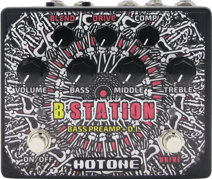 The Hotone B Station Bass Preamp/DI is a compact effects pedal that functions as a bass preamp and direct injection box, providing a versatile tonal palette for bass instruments. This preamp pedal offers multiple tone shaping controls and integrated features designed for studio and stage applications. The B Station includes a 3-band EQ, compressor, and overdrive circuit, with a DI output for direct connection to mixers and recording equipment. Additional connectivity options include an auxiliary input for external audio sources and a headphone output for silent practice. The pedal’s robust design supports a wide range of bass tones while accommodating various performance and recording setups.