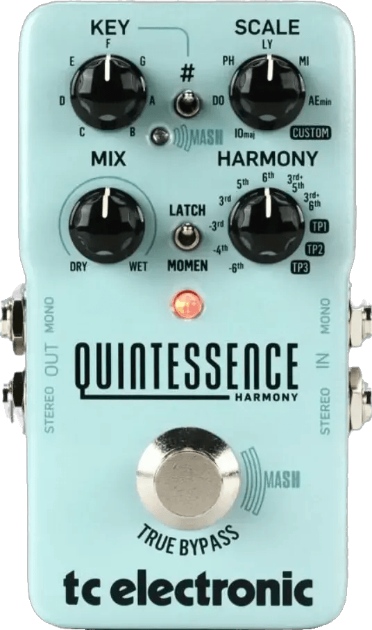 **QUINTESSENCE HARMONY is an intelligent harmony effects pedal designed to deliver real-time, scale-accurate pitch shifting for a variety of musical applications.** This harmonizer pedal provides multiple harmony intervals, selectable modes, and includes integrated TonePrint technology for deep editing and access to custom scales. Features include TC Electronic's MASH technology, enabling expression effects and momentary harmonization using footswitch pressure, as well as the ability to bend harmonized notes dynamically. Controls allow for choice of key, scale, and harmony interval, while storing and recalling user presets. Connectivity options include mono/stereo input and output, with true bypass switching for transparent signal routing when the pedal is bypassed.