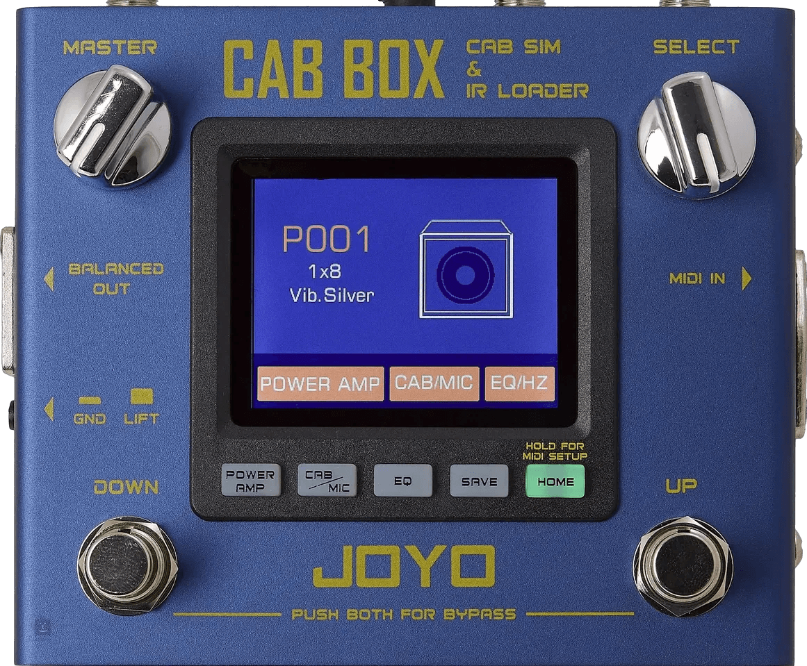 The JOYO CAB BOX is a cabinet modeling effects pedal designed for loading and managing impulse responses (IRs). It features four tube power amp simulations, 20 onboard cabinet models, and 11 microphone models. Users can load and store up to 20 preset IRs, with additional storage for 10 third-party IR files. The pedal connects to a computer via USB for tone editing, firmware updates, and IR management using JOYO’s dedicated software. The interface includes an enlarged display and expanded control layout for direct navigation and adjustments.