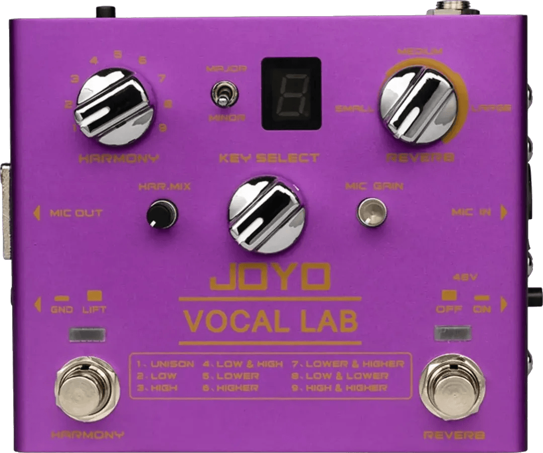The JOYO VOCAL LAB is a vocal harmony effects pedal designed for singers, providing up to two simultaneous harmony tracks and a selection of 9 harmony effect types. This vocal processor pedal supports 24 diatonic major or minor key selections, allowing users to toggle between major and minor modes. Independent reverb control and separate footswitches for harmony and reverb offer flexible live use. The unit includes 48V phantom power, supporting various microphone types for both studio and live settings.