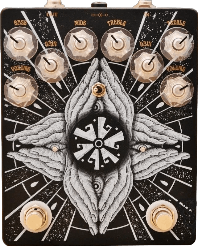 The Black Arts Toneworks Quantum Mystic OD is an overdrive/distortion effects pedal developed in collaboration with Mike Scheidt of YOB. This distortion pedal is based on the Ross Distortion circuit and features a three-band active EQ placed between gain stages, enabling precise control of bass, mids, and treble frequencies. The active EQ section allows boosting or cutting specific frequency bands, shaping the overdrive response and varying the amount of distortion affecting each range. The pedal is designed with a focus on low-gain clarity and articulation, providing useful tone-shaping capabilities for both live and studio use. Known for its volume-boosting capabilities and flexible EQ, it offers adaptable amp-pushing options and dynamic tonal adjustments.