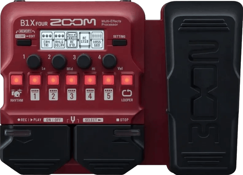 The Zoom B1X Four is a multi-effects pedal designed for bass instruments, offering a wide range of over 70 built-in effects and amplifier models. This Zoom bass effects pedal provides integrated features such as a looper, onboard rhythm patterns, and the ability to connect to the Zoom Guitar Lab for downloading additional effects. The unit includes an expression pedal for real-time parameter control. All functions are accessed via an intuitive interface suited for live or studio use.