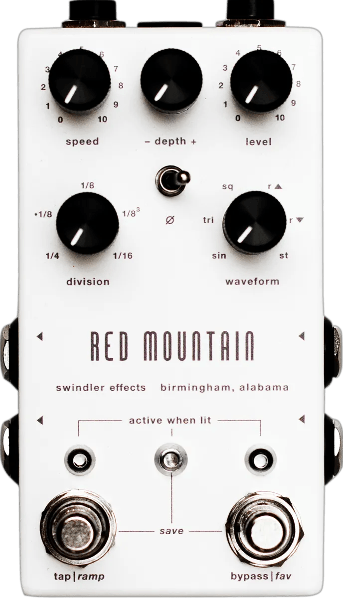 The Red Mountain is a stereo tremolo effects pedal designed for versatile modulation control. It offers Speed, Depth, and Level controls on the upper panel, with Speed and Depth parameters adjustable via an external expression pedal input. The pedal provides five selectable tap tempo divisions and features six waveform options, including a Stutter mode that transforms the tap tempo footswitch into a momentary signal killswitch. The stereo output enables wide spatial effects, and the pedal supports a range of tempo and waveform settings for precise modulation.