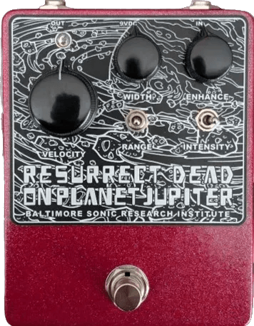 Resurrect Dead on Planet Jupiter is an analog optical phase shifter pedal designed to deliver a wide range of phase modulation effects. The Range toggle works in tandem with the Velocity control, allowing sweep rates that span from extremely slow (over 20 seconds per cycle) to high-speed modulation suitable for audio-rate and ring modulator textures. Width and Enhance controls provide further shaping of the modulation depth and character, from subtle movement to pronounced phase shifting. The Intensity toggle offers a choice between four-stage and six-stage analog optical phase shift circuits, adjusting the overall effect range.