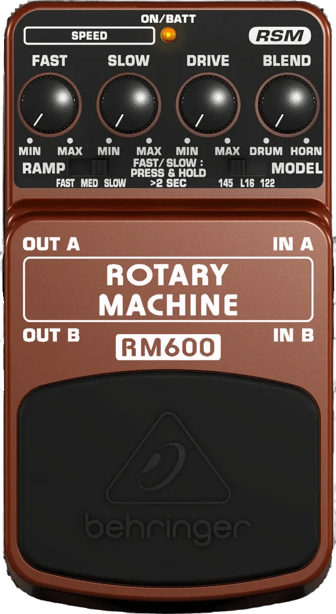 The Behringer RM600 is a rotary speaker effects pedal designed to recreate the classic rotating speaker sound. This stereo modulation pedal features Real Sound Modeling technology and offers controls for slow and fast rotation speeds, Drive, and Drum/Horn blend. Two slide switches allow selection between three ramp speeds and three rotary speaker sound types. Stereo output provides options for running dual amplifiers, while true bypass ensures signal integrity when the pedal is not engaged. The RM600 operates on a 9V battery or compatible DC power supply.