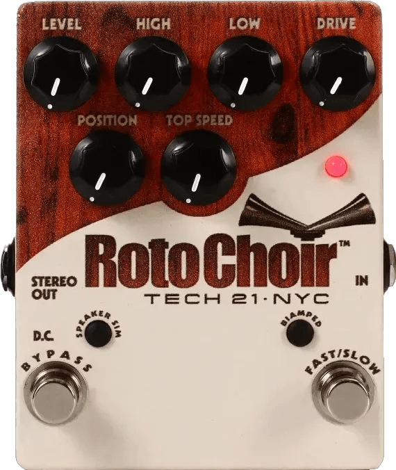 The Tech 21 Roto Choir is a rotary speaker effects pedal designed to emulate the sound and response of both a rotating lower speaker and a treble rotor horn. Using proprietary SansAmp technology, this modulation stompbox replicates the entire rotary speaker signal chain, including tube power amp behavior and microphone capture. The pedal provides control over drive, EQ, top speed, rotor acceleration, and microphone position, offering precise emulation adjustments. The Fast/Slow footswitch allows real-time switching between rotor speeds, and additional features include a biamped/single-speaker mode, true stereo output, and an onboard speaker simulator for direct recording applications.