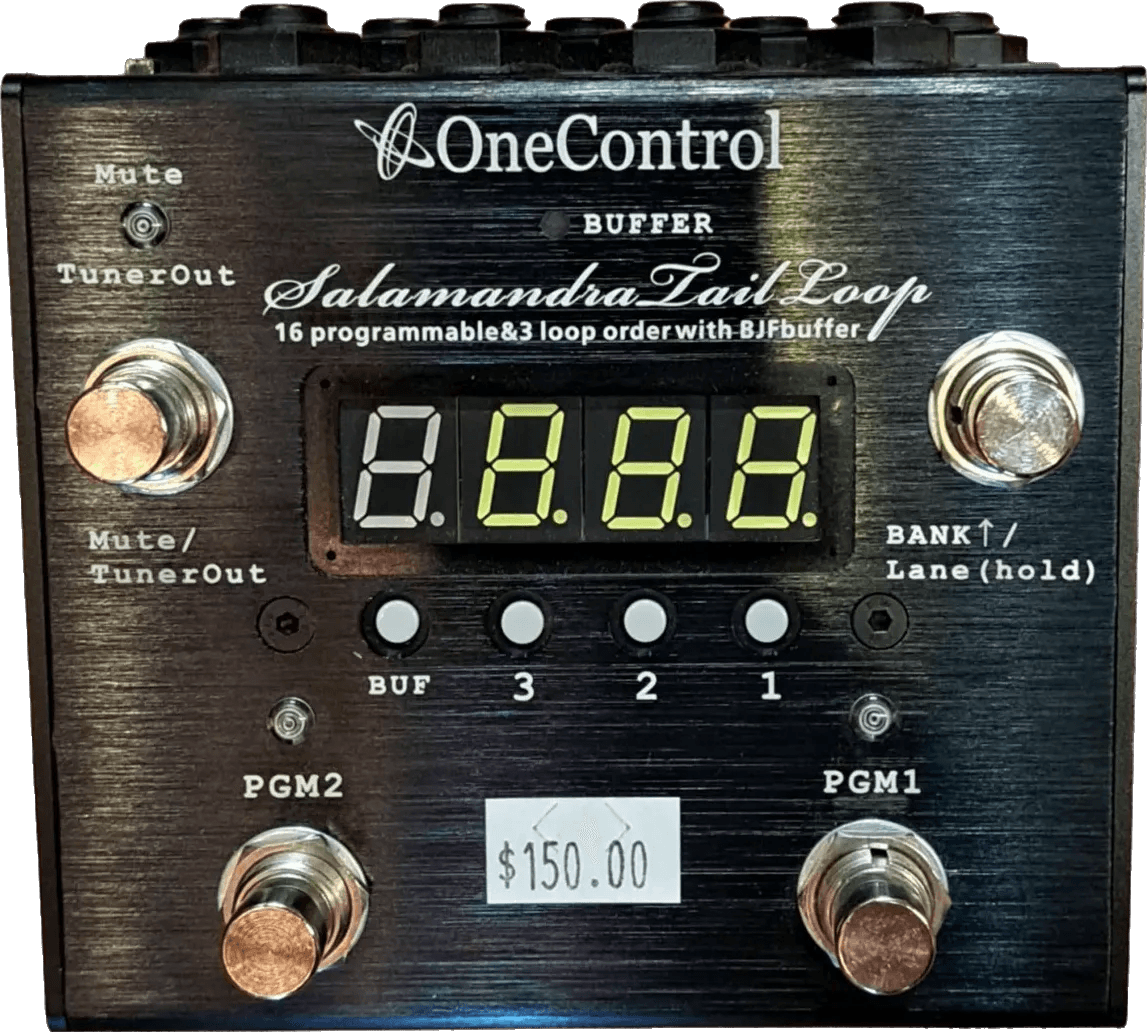 The One Control Salamandra Tail Loop is a 3-loop programmable effects loop switcher designed for flexible pedalboard signal routing. This pedal allows for individual activation of three separate effects loops and offers programmable switching, enabling users to reorder the loops in up to 16 different configurations, such as 1-2-3, 3-2-1, and 2-3-1. Features include an input buffer for maintaining signal integrity, a dedicated tuner output, and a lock switch to prevent accidental program changes during performances. The compact enclosure is constructed from durable aluminum and operates on standard 9V DC power.