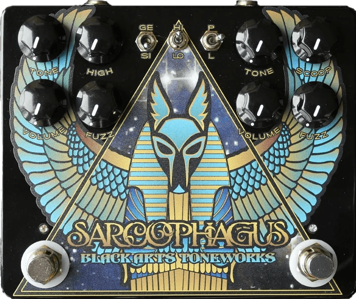 The Black Arts Toneworks Sarcophagus is a dual fuzz effects pedal that integrates both the Pharaoh and LSTR fuzz circuits in a single enclosure. This pedal features a mode toggle to select the order of the circuits—either Pharaoh into LSTR or LSTR into Pharaoh—offering expanded tonal shaping and stacking options. Both circuits maintain independent controls, with the design aimed at maximizing gain, low end, and output volume. The Sarcophagus is a true bypass fuzz stompbox, optimized for noise-free operation.