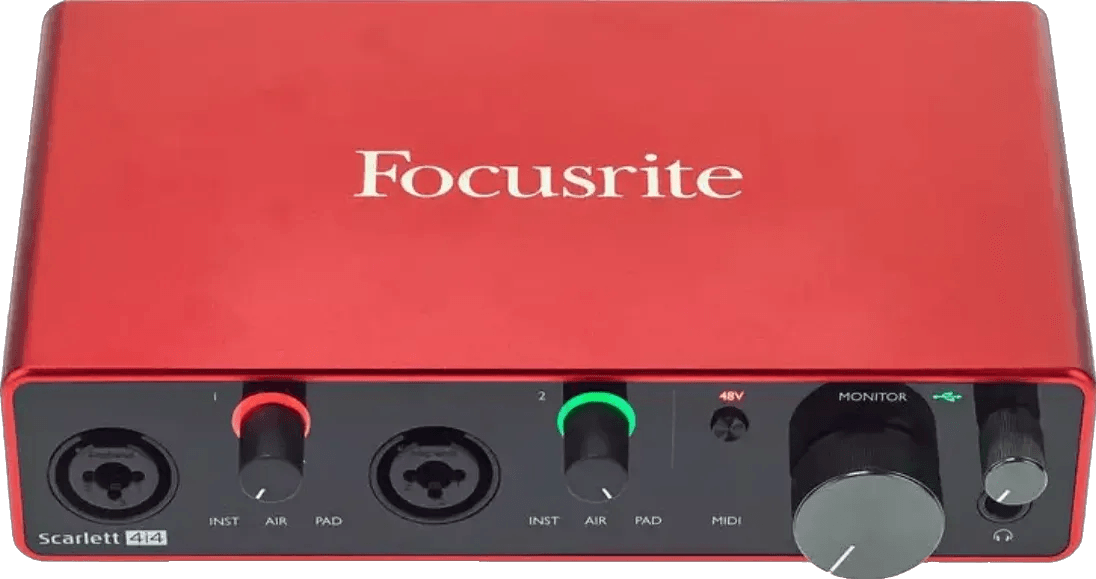 The Focusrite Scarlett 4i4 audio interface provides a compact solution for multitrack recording, offering four simultaneous inputs and four outputs. This USB audio interface includes two ultra-low-noise microphone preamps with switchable Air mode, as well as Hi-Z and line inputs. MIDI in and out allow integration with external MIDI controllers and synthesizers. Individual headphone, monitor, and line outputs provide dedicated mixes for flexible monitoring setups. Auto Gain and Clip Safe functions help manage input levels during recording.