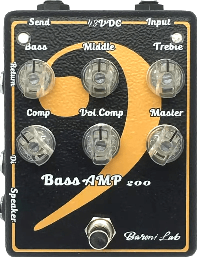 - Class D bass amplifier pedal with 200W RMS at 4 ohms