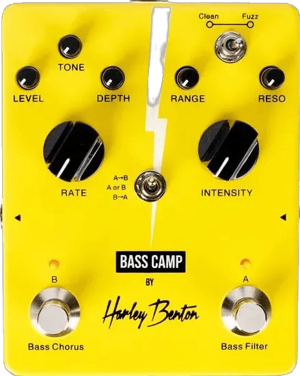 The Harley Benton Bass Camp is a bass chorus and filter effects pedal designed for shaping and enhancing bass tone. It features a classic chorus effect specifically adapted for bass frequency ranges, alongside a flexible filter section. The filter module provides options to select frequency range, control effect intensity, adjust the low-end response, and introduce variable levels of fuzz. Connectivity is straightforward, and the pedal is optimized for bass instrument compatibility.