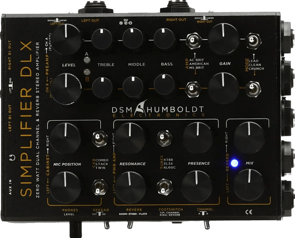 The DSM & Humboldt Simplifier DLX is a stereo amp simulator pedal designed for pedalboard integration, providing a range of amp tones without the need for a physical amplifier. As part of the “zero-watt” amp series, this unit offers dual preamps, cab sim options, and comprehensive stereo routing. It is engineered for musicians requiring stereo output and compact amp modeling solutions directly on their pedalboards.
