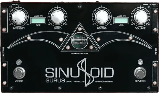 The Gurus Amps Sinusoid is a 100% analog, tube-driven reverb and vibrato effects pedal, modeled after the classic 1963 Fender Vibroverb amplifier. This pedal features a tube-driven optical tremolo circuit replicating the Vibroverb’s vibrato channel and an integrated Accutronics spring reverb tank for authentic analog reverb sounds. Both effects can be used independently or combined, with separate controls for each section.