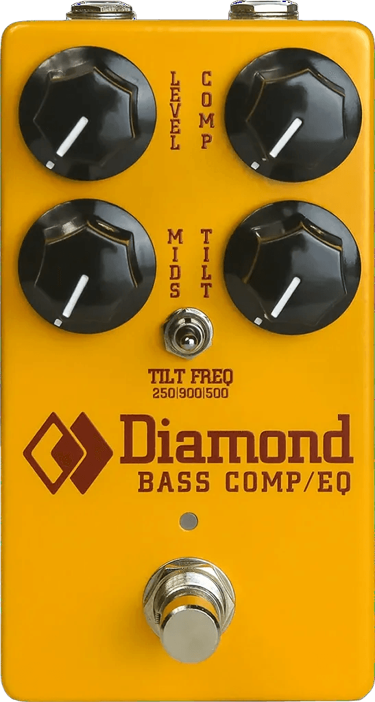 The Diamond Pedals Bass Comp/EQ is a bass compressor effects pedal with integrated tilt frequency EQ, designed to provide dynamic control and tonal shaping for bass instruments. This compressor pedal utilizes optical compression circuitry, offering smooth response with a range of compression ratios. The onboard tilt EQ allows for quick adjustments to overall tonal balance, while additional EQ controls enable fine tuning of high and low frequencies. The pedal features true bypass switching for transparent signal integrity and includes a convenient top-mounted 9V DC power input.