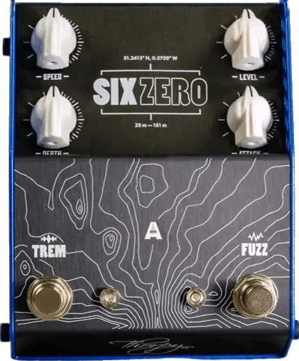 The ThorpyFX Six Zero is an all-analog fuzz and tremolo effects pedal, designed and hand-built in the UK by Adrian Thorpe MBE with Dan Coggins. Combining classic fuzz tones with integrated analog tremolo, this fuzz stompbox provides extensive sound-shaping options for a variety of applications.