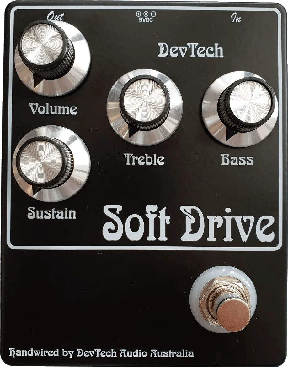 The Soft Drive overdrive effects pedal is designed to recreate the sound and response of vintage valve amps, based on the Pete Cornish SS-3 circuit. Utilizing germanium NOS diodes, this overdrive pedal provides a range of tonal options, from mild amp-like breakup to powerful rhythmic distortion and saturated lead tones. The circuit includes a Cornish-style buffer preamp, offering reduced RFI, low impedance output, and minimized "ghost noise" in bypass. The bypass mode is selectable between a buffered bypass and a true bypass via an internal switch. The Soft Drive includes an LED footswitch with internal brightness adjustment and offers control over volume, bass, treble, and sustain.