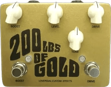 The Lovepedal 200 LBS of Gold is a fuzz effects pedal that combines a modified vintage fuzz circuit with a TS808-style overdrive, featuring an integrated tone control for wide sound-shaping capability. The pedal utilizes a circuit modification at the fuzz input for compatibility with various pedal and amplifier setups, including wah and boost pedals. Designed to deliver refined fuzz tones, this Lovepedal stompbox includes a tone knob to adjust a broad range of tonal characteristics, beyond traditional fuzz face voicing.