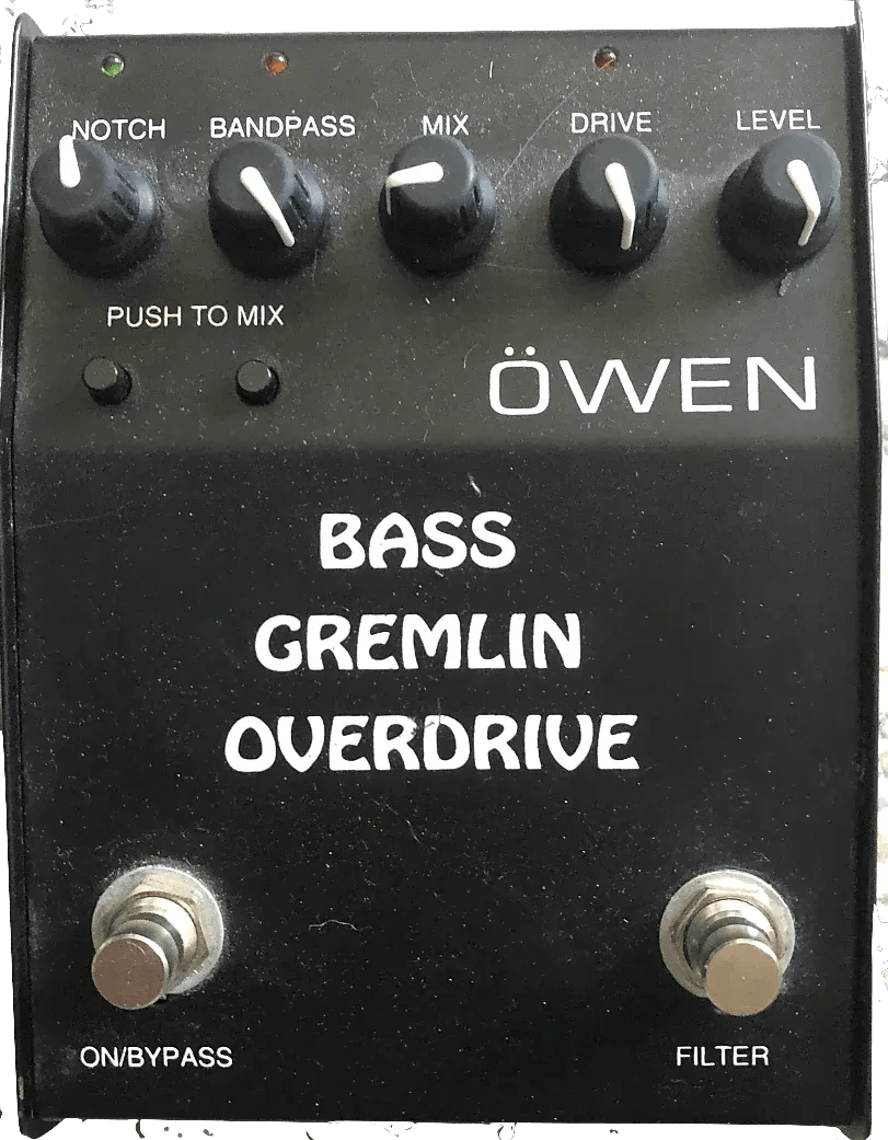 The Owen Electronics Bass Gremlin Overdrive is a dedicated bass overdrive effects pedal designed to provide a wide range of driven tones for bass instruments. This analog overdrive pedal uses high-quality components to preserve low-end clarity while delivering harmonically rich distortion. Control layout includes Gain, Tone, and Level knobs, allowing adjustment of drive intensity, EQ shaping, and output volume. The pedal features a true bypass circuit for unaffected signal integrity when disengaged. Built for standard 9V DC operation and designed to handle the output of bass guitars, the Bass Gremlin Overdrive offers robust performance suitable for various styles.
