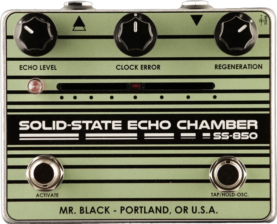 The Mr. Black Solid State Echo Chamber (SS-850) is a digital delay pedal designed to recreate the sound characteristics of classic tape echo units. Utilizing a slider-based control for adjusting delay time, the SS-850 offers detailed and precise delay settings, similar to those found on vintage tape echo devices. The delay time slider features an integrated LED, which visually indicates the tempo based on manual adjustments or when the tap tempo function is engaged. This effects pedal is equipped with standard input and output connections and operates as a true bypass unit.
