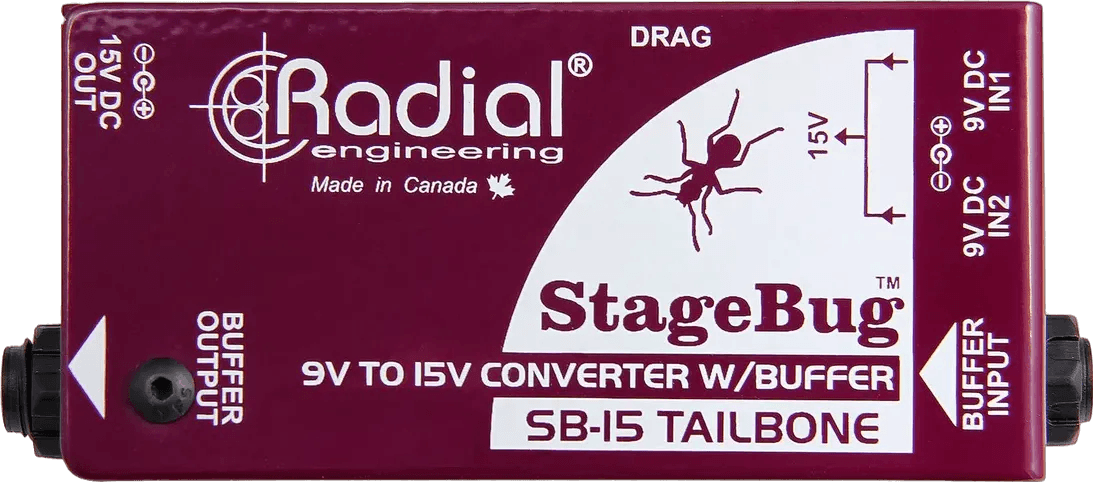 The Radial Stagebug SB-15 buffer pedal is a class-A signal buffer engineered to maintain signal integrity when connecting multiple effects pedals. Placed at the start of the signal chain, the SB-15 reduces noise and prevents signal loss across complex pedalboards. The unit also features power conversion, allowing two standard 9V power outputs to be combined into a single 15V supply for powering select Radial and Tonebone 15V-compatible effects pedals.
