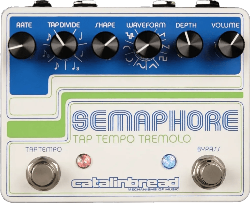 The Catalinbread Stereo Semaphore is a stereo tremolo effects pedal designed to deliver versatile modulation via optically controlled JFET gain stages. This pedal provides a clean boost alongside extensive tremolo options, featuring a wide selection of waveforms including square, triangle, sine, ramp, and random shapes. With the Shape contour control, users can morph waveforms to access additional modulation textures. The Stereo Semaphore operates in both mono and stereo modes and includes a dedicated tap tempo control for precise timing adjustments. Additional connectivity features include control voltage (CV) input and output, allowing synchronized operation with compatible pedals equipped with tap tempo functions.