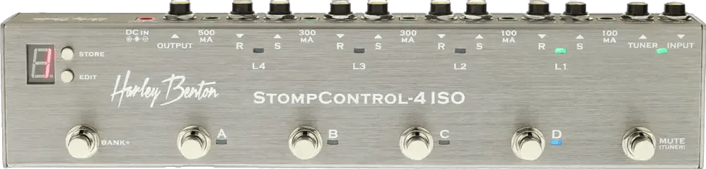 The StompControl 4 ISO is a 4-loop effects pedal switcher and integrated power supply designed for efficient pedalboard management. This pedal switcher allows users to organize and recall up to 20 presets across 5 banks, each containing 4 patches. An onboard display with LED indicators shows current loop and preset status. The integrated isolated power supply offers two 9V 100 mA outputs, two 9V 300 mA outputs, and one 9V 500 mA output. Additional features include a dedicated tuner output for silent tuning.